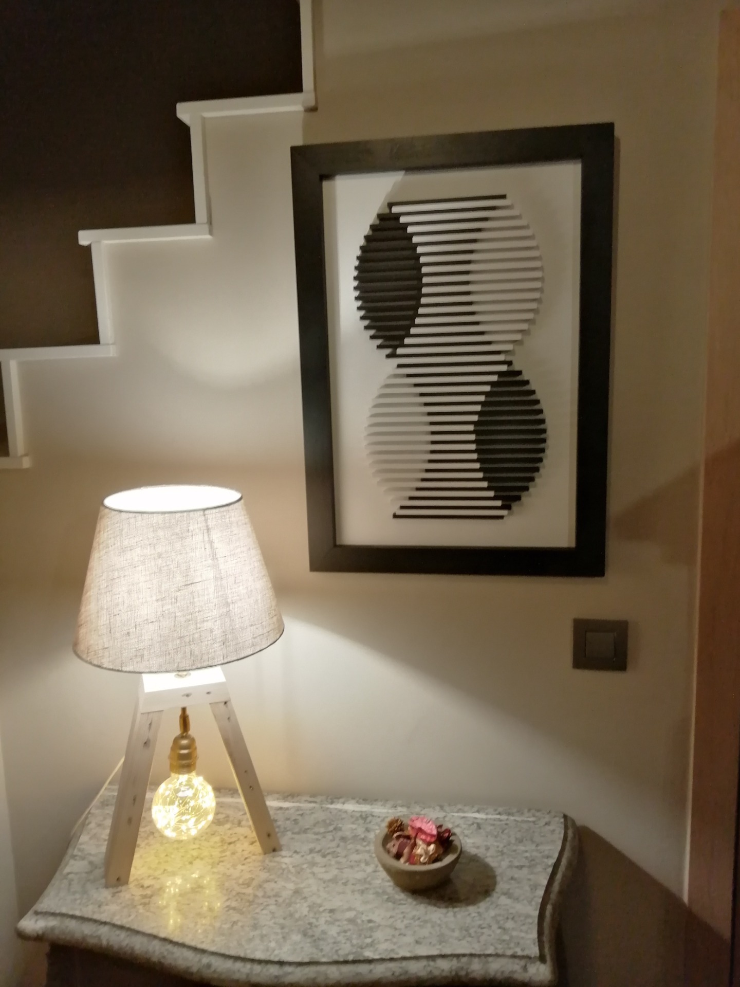 Je réalise des tableaux contemporains, des lampes et des objets de décoration en bois